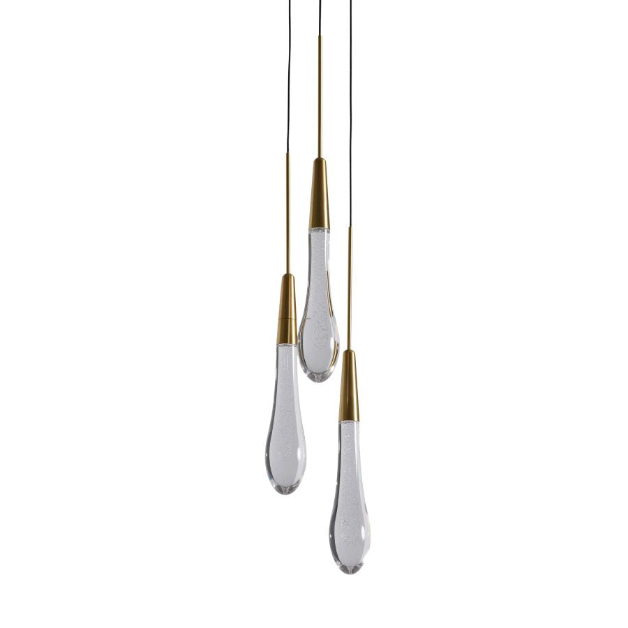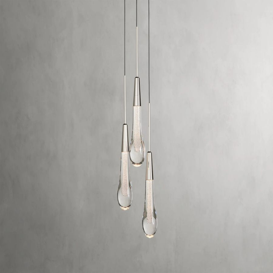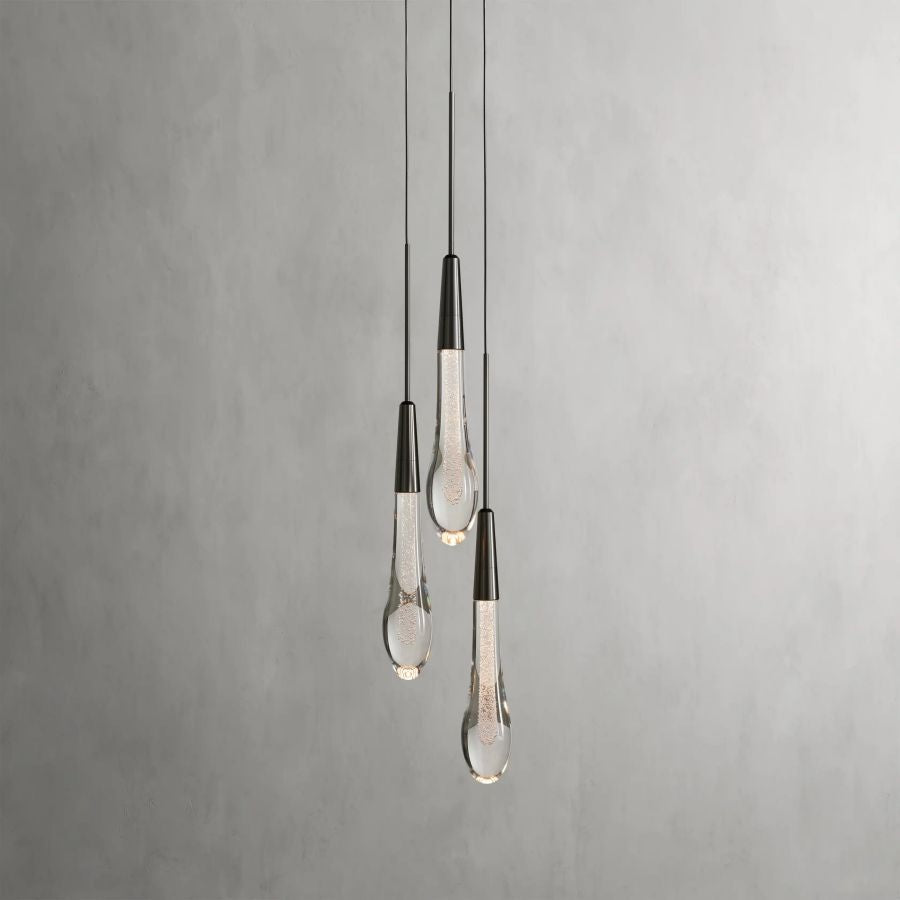 Featuring adjustable PVC cords cascading into integrated LED lights handcrafted from seeded glass, this Lighting Collection mimics the look of a fallen raindrop.