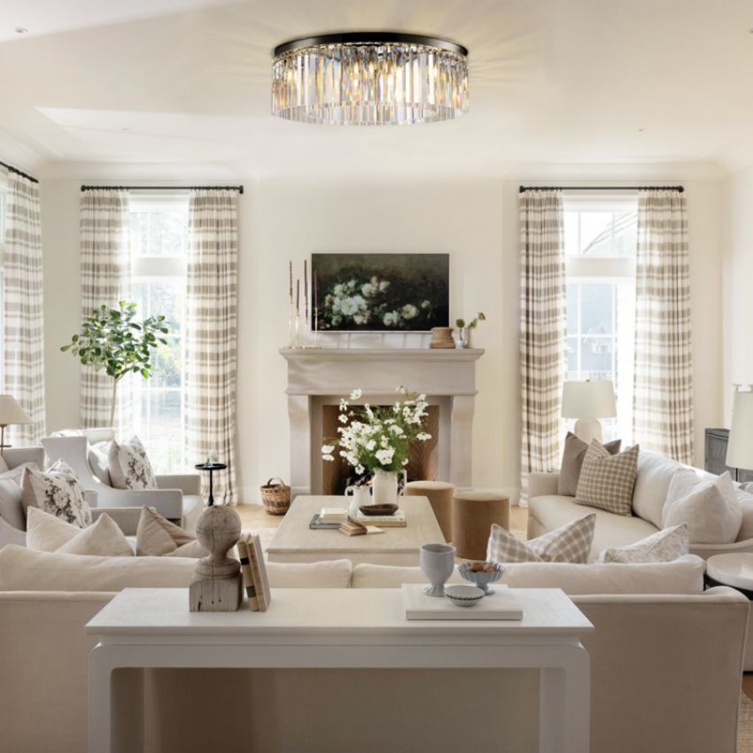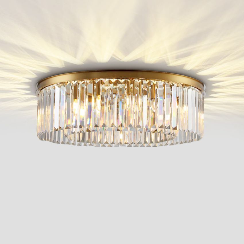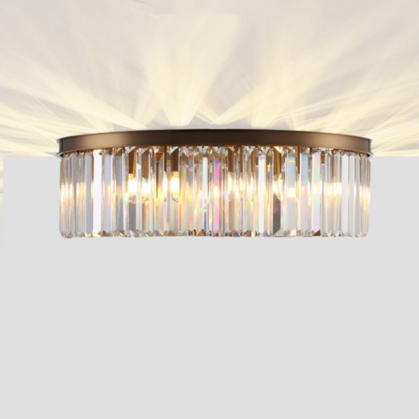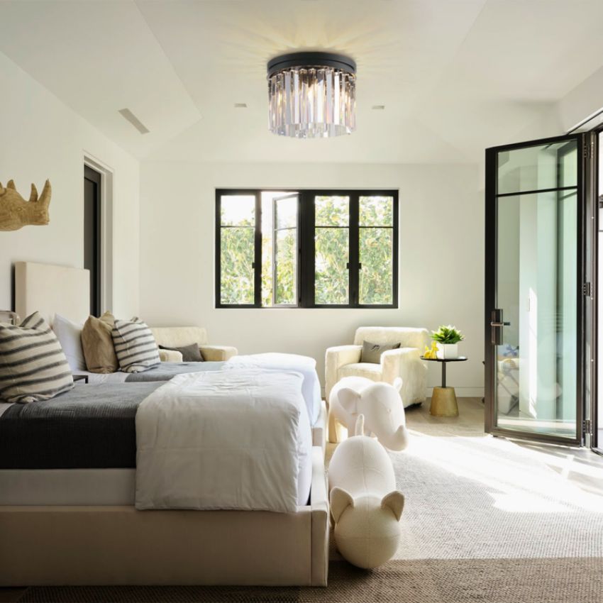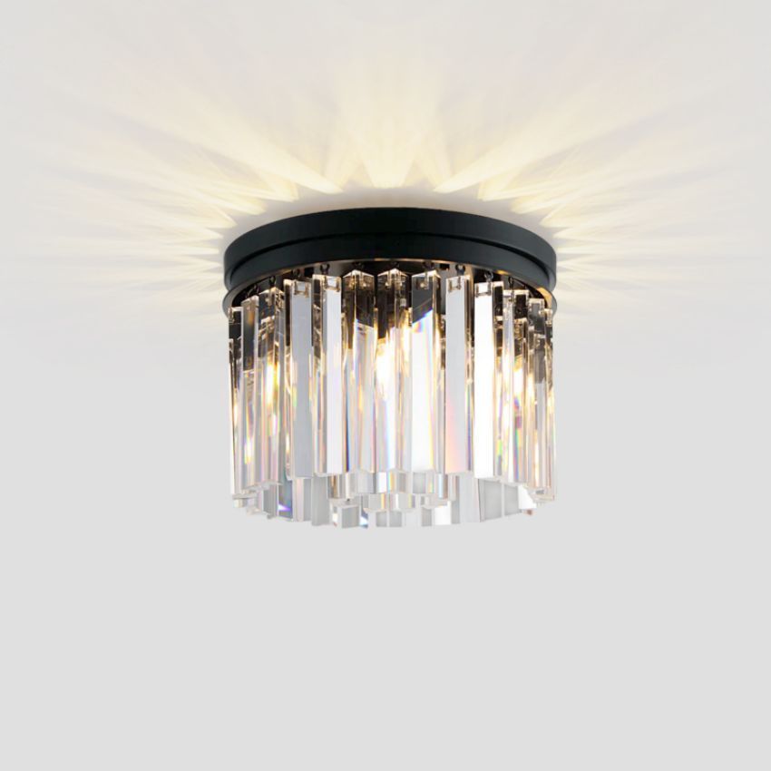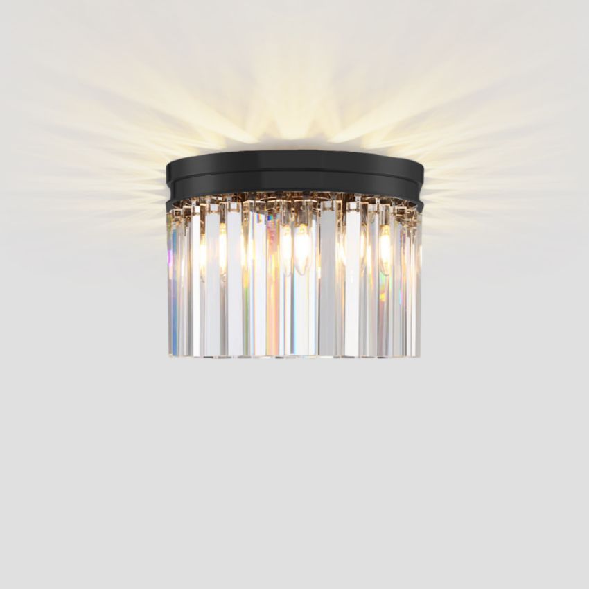 The Ryan collection captures the era’s fascination with geometric shapes. Hundreds of faceted, dynamic prisms subtly refract light, evoking the allure of the era. Angular glass hangs like lush fringe from welded iron frames, juxtaposing elegance with industrialism.