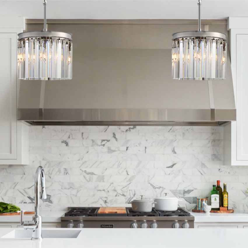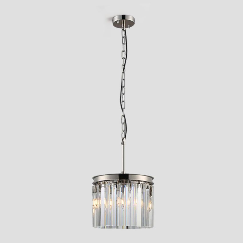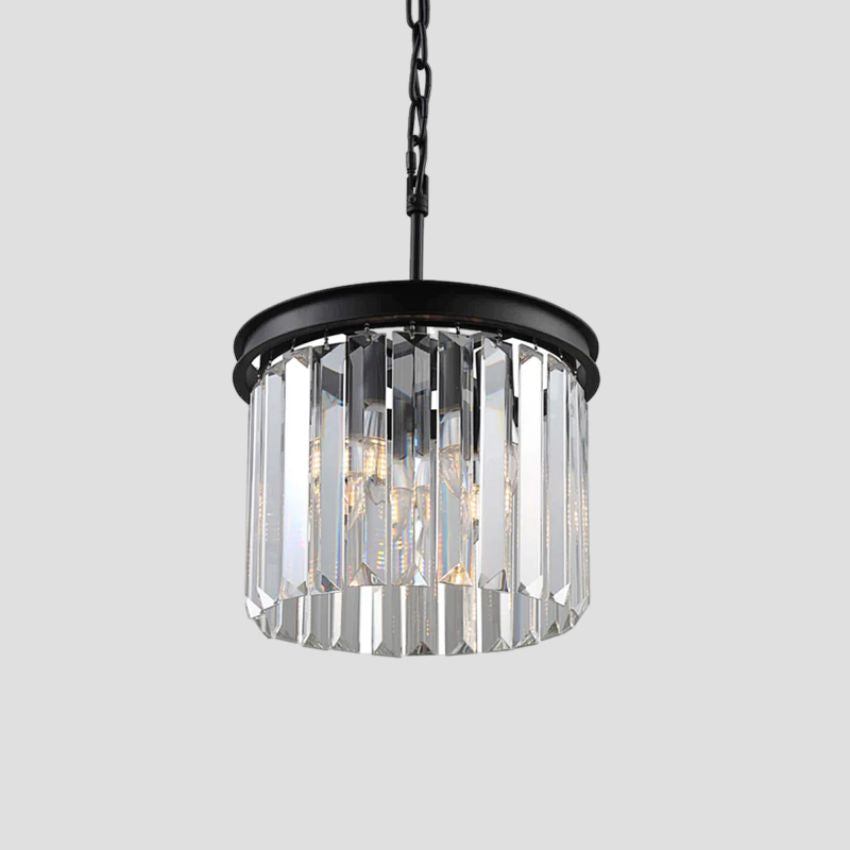 The Ryan collection captures the era’s fascination with geometric shapes. Hundreds of faceted, dynamic prisms subtly refract light, evoking the allure of the era. Angular glass hangs like lush fringe from welded iron frames, juxtaposing elegance with industrialism.