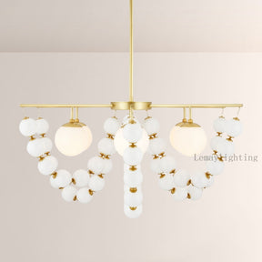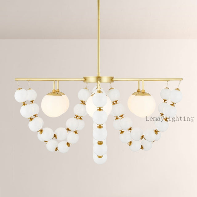 The GenLuxe - series chandelier, with cascading white glass orbs and polished brass accents, blends artistic charm and luxury, ideal for elevating upscale American spaces.