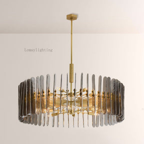 This Klassic - series chandelier, with layered textured glass panels and polished brass accents, blends vintage charm and modern luxury. A perfect statement piece for upscale American homes.