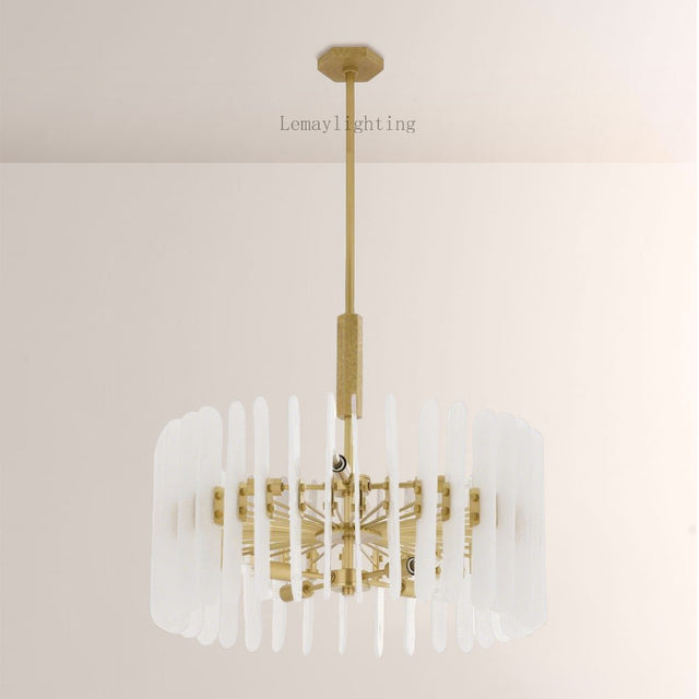 This chandelier features layered frosted glass panels and polished brass details, blending mid - century modern charm with luxury. A stunning centerpiece for upscale spaces.