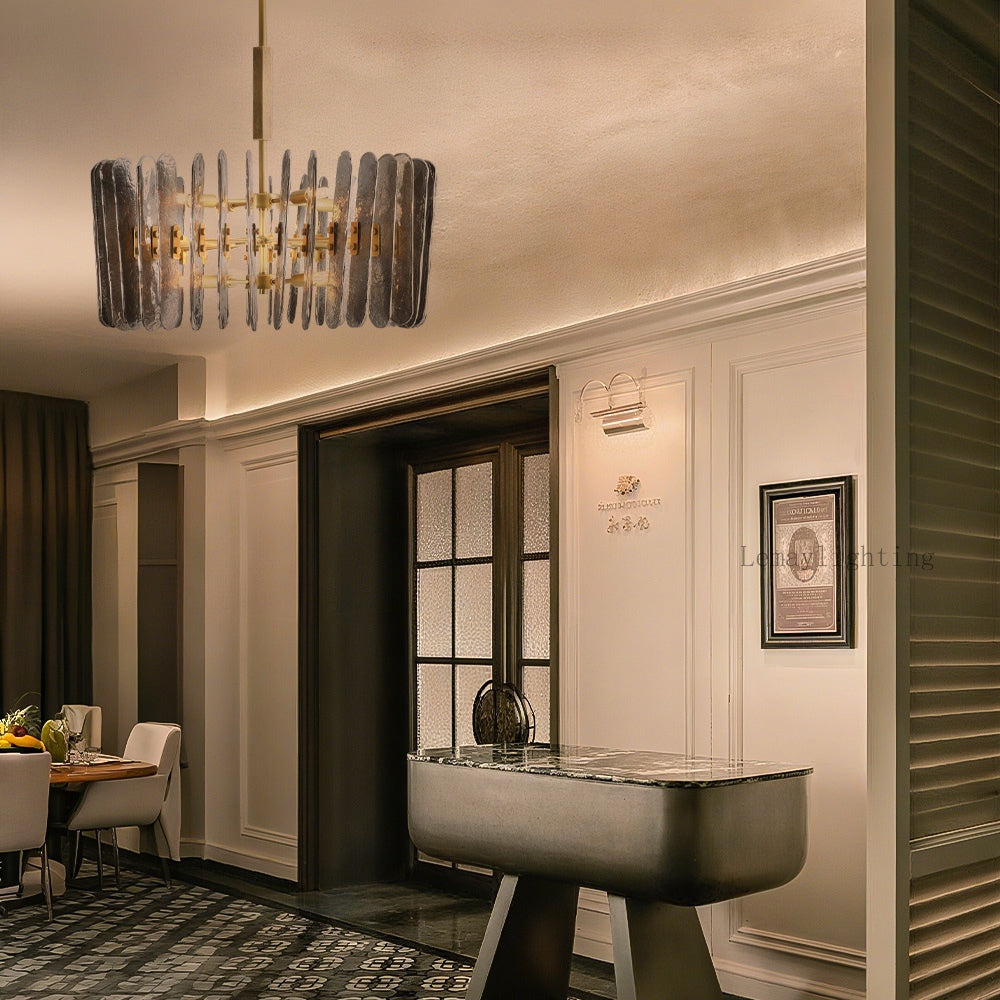 This Klassic - series chandelier, with layered textured glass panels and polished brass accents, blends vintage charm and modern luxury. A perfect statement piece for upscale American homes.