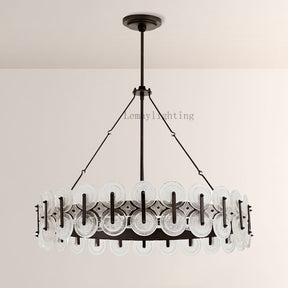 The RonRegal - series chandelier, with layered textured glass discs and a sleek dark metal frame, blends modern artistry and luxury, ideal for elevating upscale American spaces.