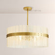 This chandelier from the Sinnacle series features a cylindrical design with textured glass panels and a brass band adorned with rivets. Suspended by a brass stem and ceiling plate, it blends vintage elegance and Art Deco luxury, making it a sophisticated focal point for high-end American interiors.