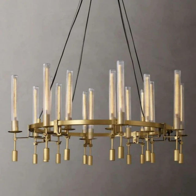 Made of solid brass, the collection's minimalist construction features Edison bulbs set in cylindrical ribbed glass that shine like candles.