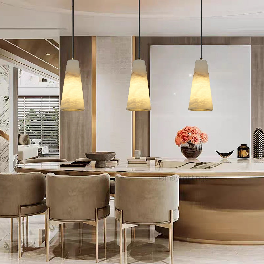 This pendant light features a textured alabaster glass shade paired with a metal canopy, blending natural elegance and modern minimalism. It’s an ideal choice for adding a refined touch to upscale American kitchens, dining nooks, or home offices, casting a warm, diffused glow.