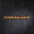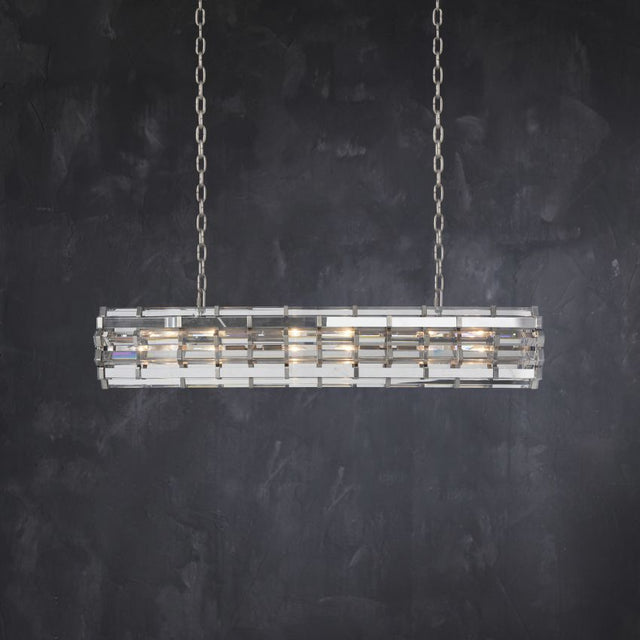 The glamorous Dipa Chandelier is inspired by unexpected flashes of light in the night. Long prisms of optical grade glass are held tightly together in a staggered effect, within a skeleton of either plated brass or polished nickel. The triangular shape of the prisms reflects and refracts the light on all sides in a shimmering dance of sparkle.