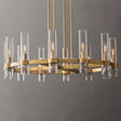 Blending modern minimalism with subtle Art Deco influences, this chandelier makes a bold yet elegant statement. Its 36-inch circular frame is crafted from solid steel, featuring clean metal bands that hold slender glass cylinders in perfect balance. Each glass shade houses an Edison-style bulb that emits a warm, candle-like glow, adding atmosphere and sophistication to any space.