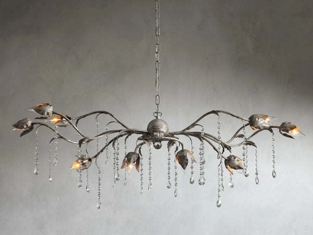 Like freshly fallen rain on draped garden vines, our Uma Lighting Collection is hand-moulded by Italian artisans from solid iron. Floral flourishes are elegantly accentuated by a hand-applied silver finish, and hand-strung crystals dangle to scatter drops of light around your space.