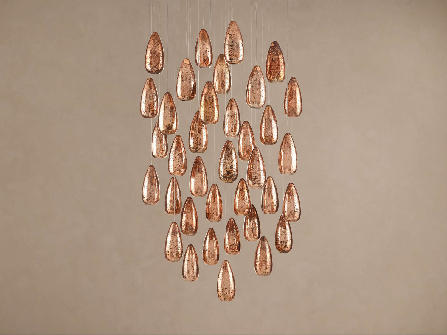 Our captivating Edda Lighting Collection features a cascade of teardrop mercury glass pendants that create a dazzling play of light and dimension, both while glowing and unlit.
