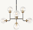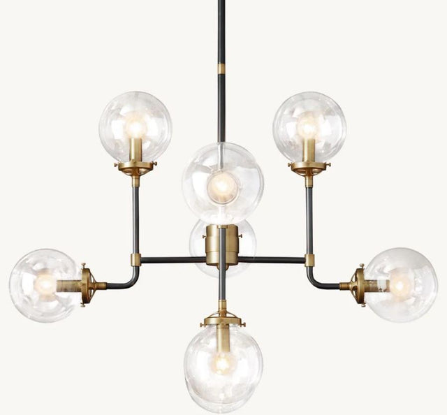 Inspired by 1940s industrialism, our globe chandelier's lines and spheres are reminiscent of an urban subway map. Glass shades are joined by metal tubing and carefully balanced on vertical threaded rods.