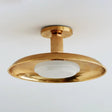 Each piece is unique, with a graceful finial hand-spun from a copper-rich brass alloy for a warm, detailed finish. Nestled inside is a flat plate hand-blown from our proprietary nude-colored glass; this custom glass interacts with the spun brass to create a quietly spectacular quality of light.
